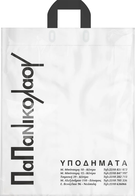 - Πλαστικές σακούλες από πολυαιθυλένιο με πρόσθετη χειρολαβή Loop, είναι τόσο ισχυρές και ελκυστικές, καθιστώντας τους μια εξαιρετικήτσάντα για την προώθηση της επιχείρησής σας.